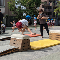 週に1~2回行われる体育レッスンでは、一人ひとりに合わせた目標を設定し、丁寧な声かけと補助を通して、安全に挑戦を重ねられるようにしています。跳び箱やマット運動、かけっこなどを通じて、自然と体幹やバランス感覚が身につき、運動への自信が育まれていきます。